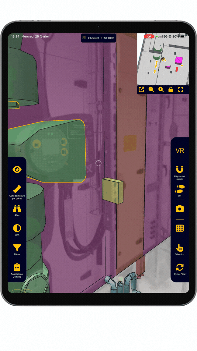 Grâce aux checklists NEXT-BIM, contrôlez rapidement des listes d’objets en Réalité Augmentée. Un guidage 3D vous mène d’objet en objet pour contrôler, valider / invalider en un clic.